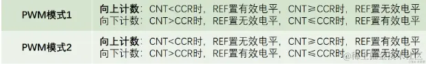 PWM模式1:无论是向上计数还是向下计数,只要CNT ⩽CCRx,PWM输出低电平(CCR值越高占空比越高)。