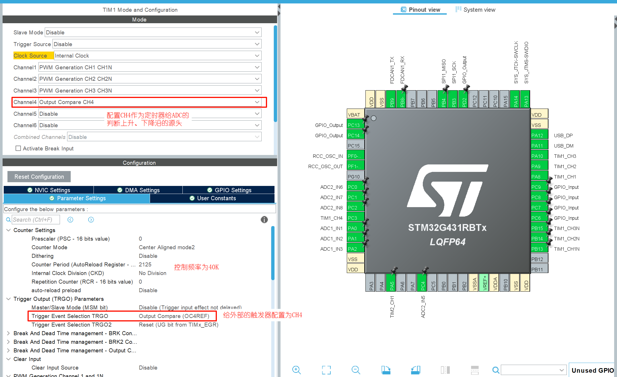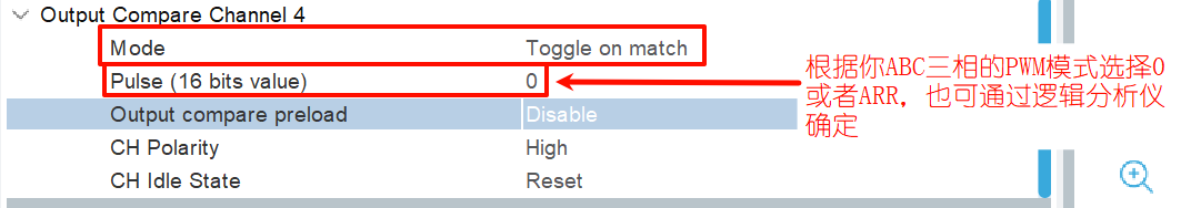 设置CH4的跳变判断条件为CNT=0,这样当计时器数到0的时候(在CNT三角在谷底的情况)CH4会进行一次跳变,也会通过TRGO传递给ADC。