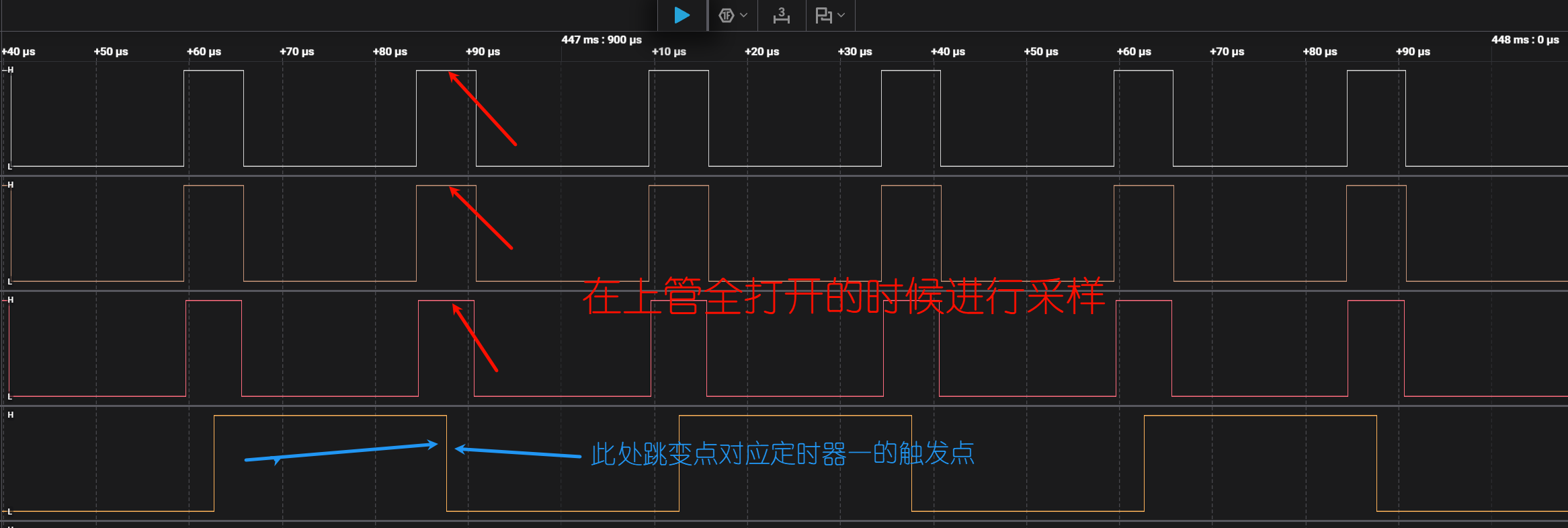 下图采样为错误示范,跳变点应该在上三相低电平中点(对应Pulse=ARR)