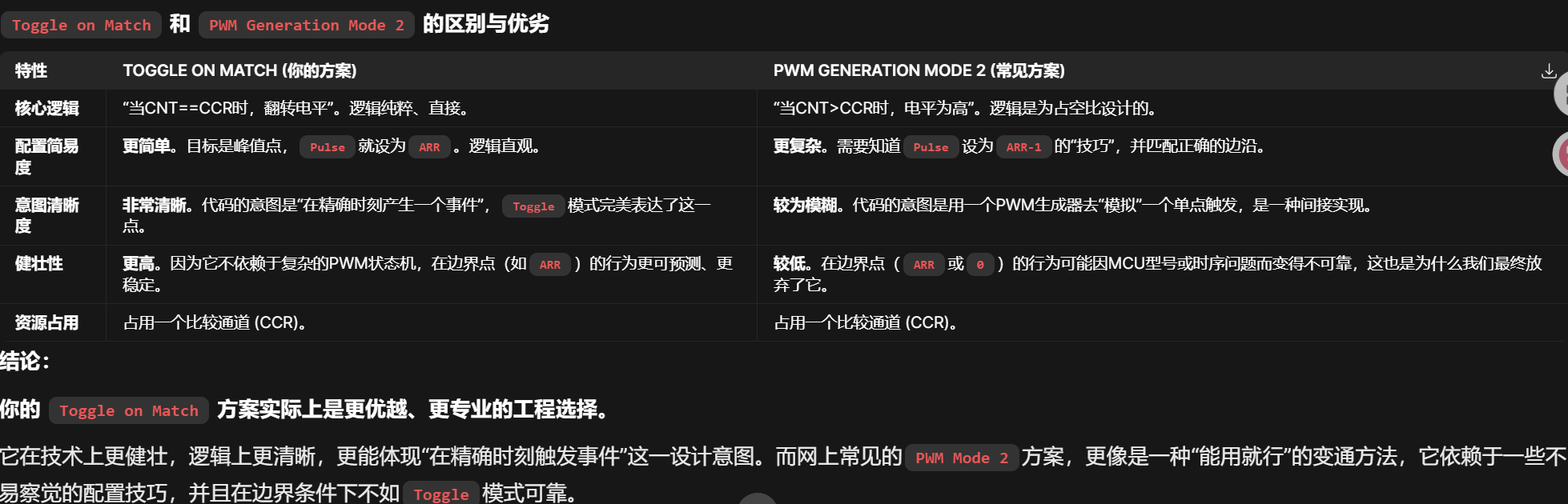对比大部分其他人的,通过PWM Generation No Output 再通过调整Pulse(Pulse略小于ARR10左右)的方案,本方案更具备更直观、科学的优点,因为PWM Generation方案Pulse不能调整到ARR或者0(太极限检测不到),会导致需要使用者去猜和多次实验使其居中。