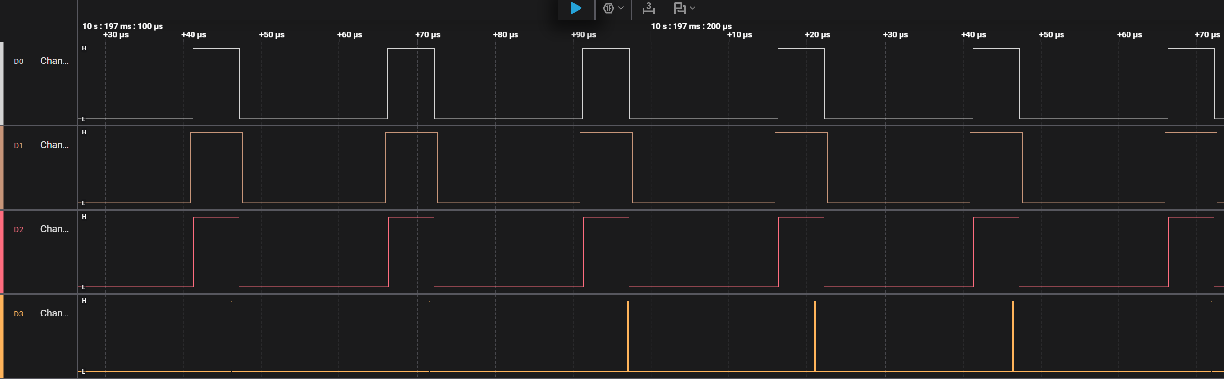 我们在ADC中断中翻转IO口进行测试。发现符合预期。稍微滞后是因为ADC采样和中断向量的传递也需要时间
