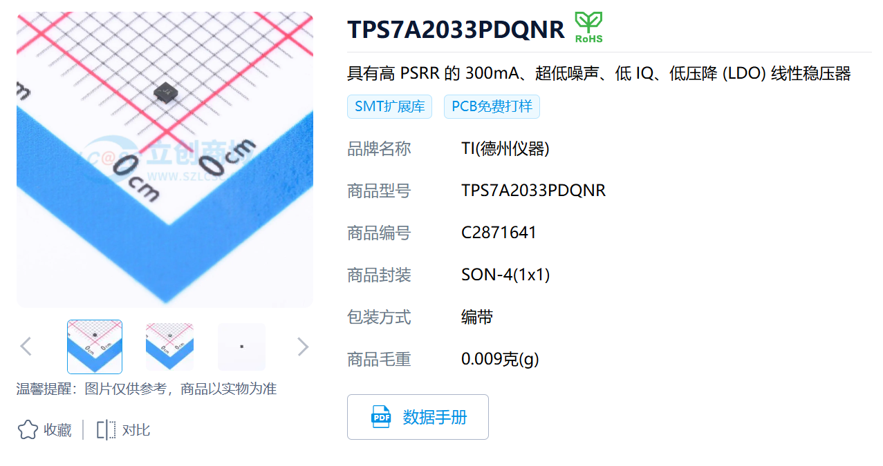 很多人推荐的TPS7A20系列,纹波超低,具有常规SOT23-5封装,此型号为SON-4 体积小的可怕,优信电子可以直接买到